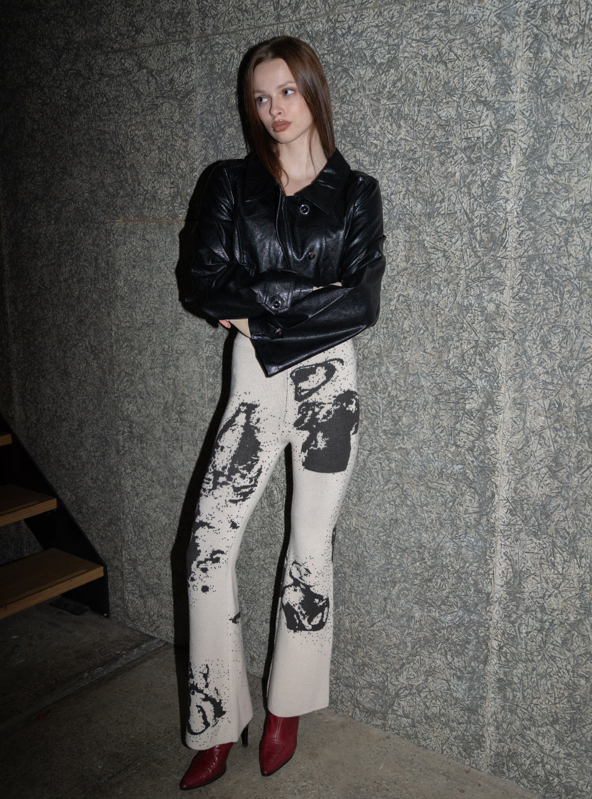 JUEMIオリジナルの、モザイクがかった土偶柄をニットに落とし込みました。