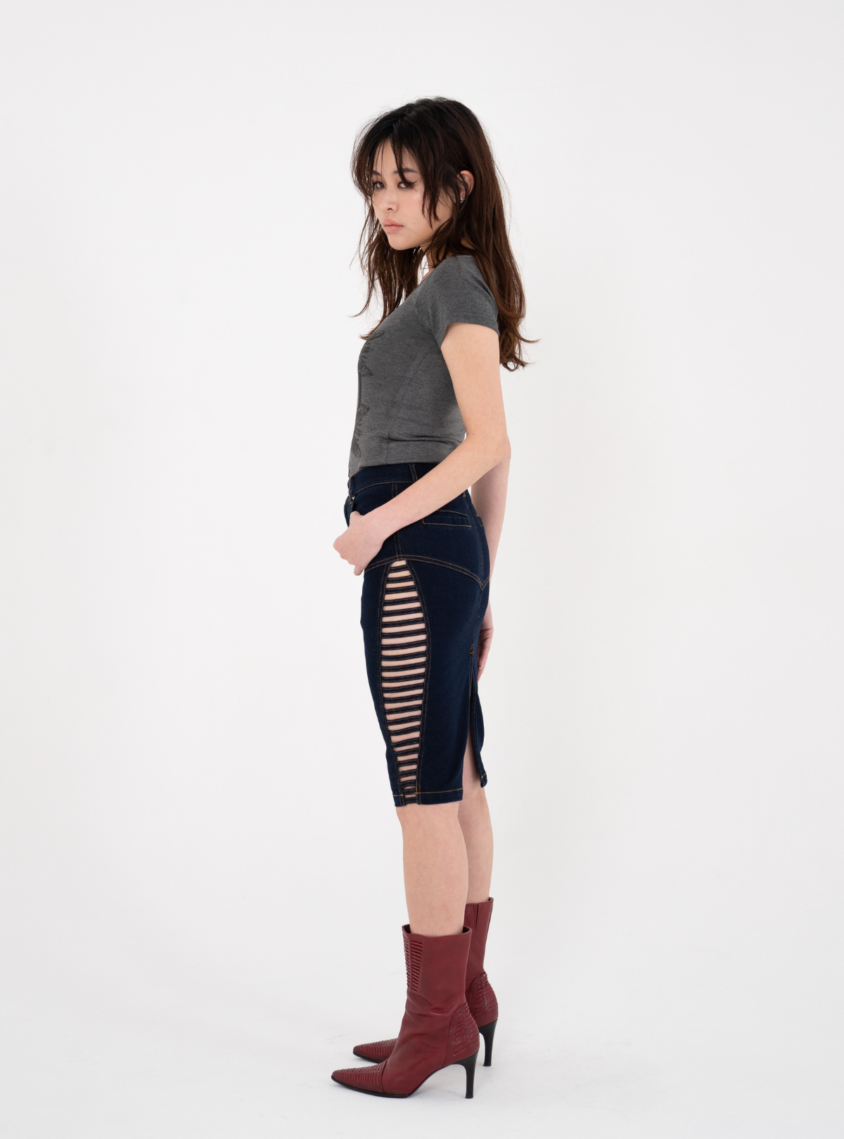 サイドのカッティングデザインが目を惹く、デニムスカート。トレンドのミディ丈に、はしご状のカッティングを施し、上品さの中にエッジをプラスしました。