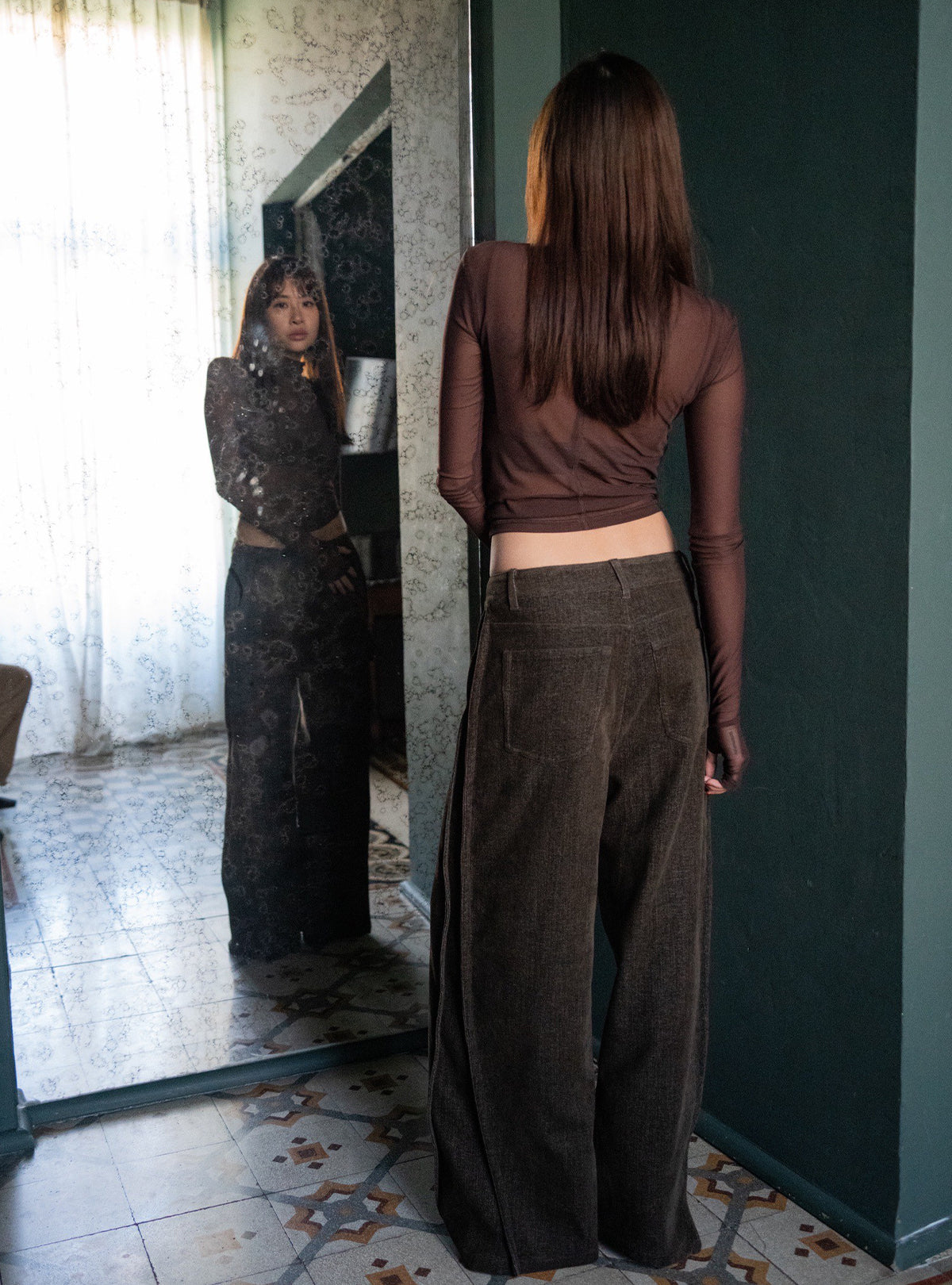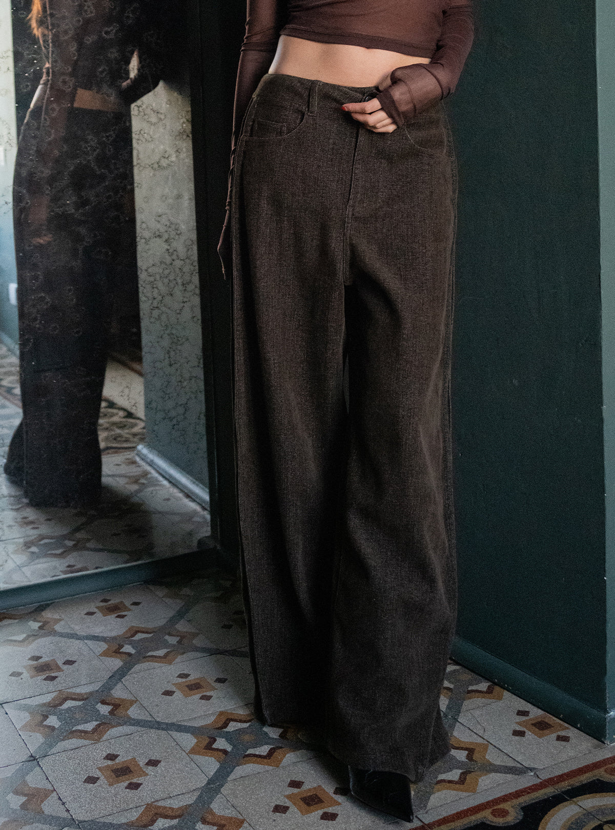 起毛感のあるピーチスキン風素材を使用し、柔らかな風合いと落ち感を持たせることで、きれいなストレートラインを引き立てています。