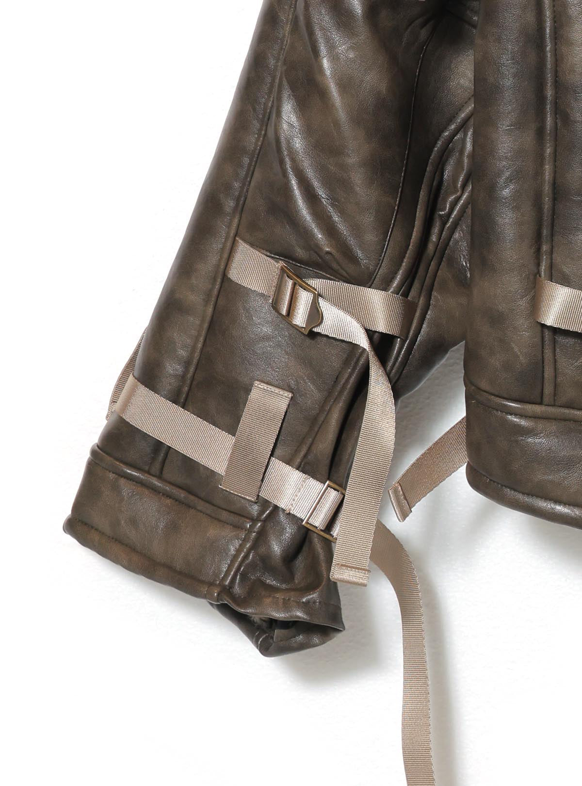 クラッシュフェイクレザーに上品な光沢のベルト、ウッド調のボタンなどを組み合わせた他にないデザイン。