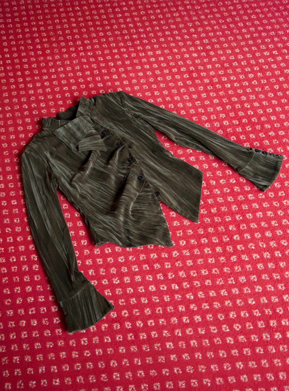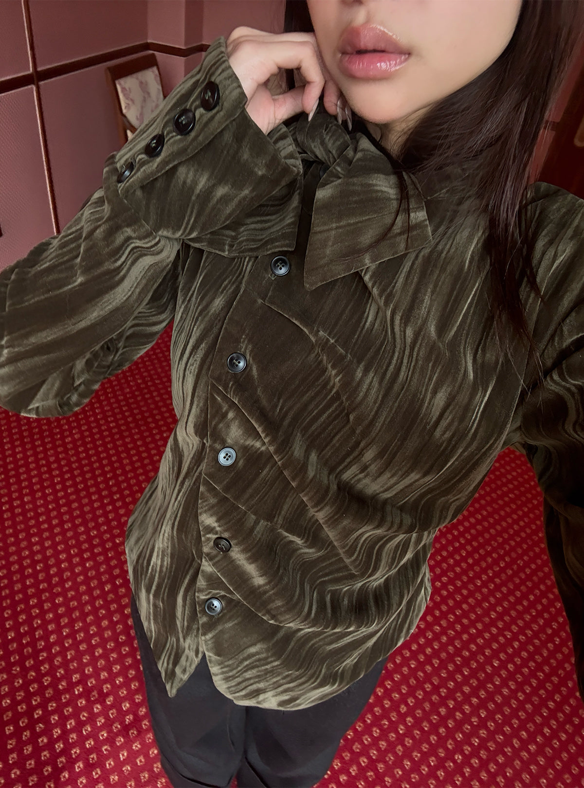 光沢感のあるベロア素材を使用した、ヴィンテージムード漂うデザイントップス。