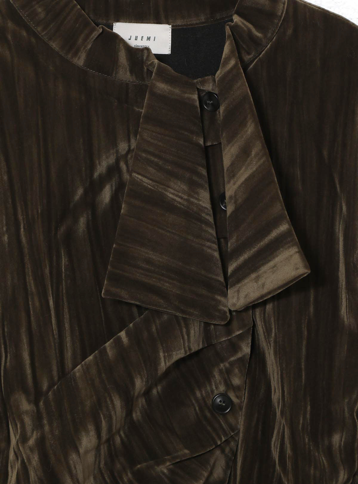 衿元はハイネック仕様で、リボンのように結ぶことでアレンジが楽しめるデザイン。